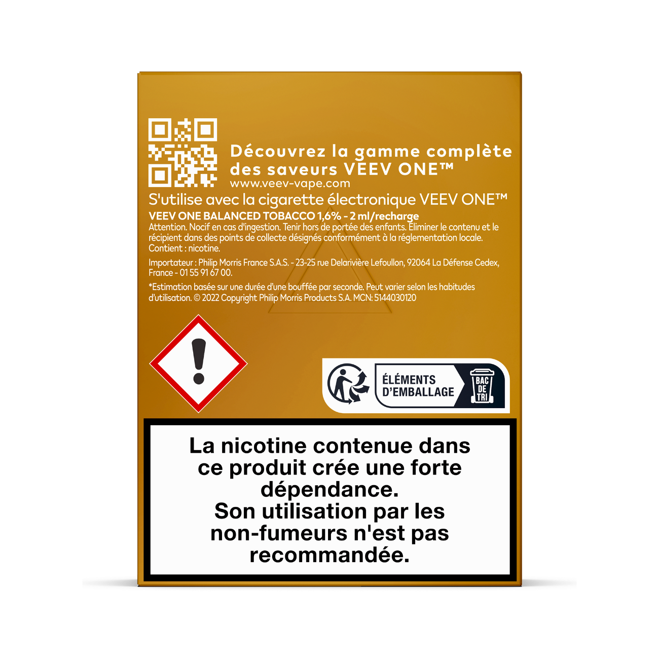 La composition des e-liquides VEEV ONE contient plusieurs ingrédients, dont les principaux sont le propylène glycol (PG) et la glycérine végétale (VG). Ces deux composants sont essentiels pour générer la vapeur lors de l'inhalation. Le PG, en plus de restituer les saveurs, est responsable du « hit », cette sensation de contraction ressentie dans la gorge au moment d’inhaler la vapeur. La VG, quant à elle, permet de produire une vapeur plus dense. En fonction des besoins et préférences des utilisateurs, les e-liquides VEEV ONE peuvent contenir de la nicotine à différents taux. À noter : la composition et les taux de nicotine de chaque pod sont clairement indiqués sur l'emballage.