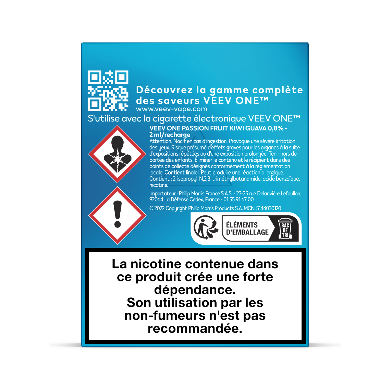 La composition des e-liquides VEEV ONE contient plusieurs ingrédients, dont les principaux sont le propylène glycol (PG) et la glycérine végétale (VG). Ces deux composants sont essentiels pour générer la vapeur lors de l'inhalation. Le PG, en plus de restituer les saveurs, est responsable du « hit », cette sensation de contraction ressentie dans la gorge au moment d’inhaler la vapeur. La VG, quant à elle, permet de produire une vapeur plus dense. En fonction des besoins et préférences des utilisateurs, les e-liquides VEEV ONE peuvent contenir de la nicotine à différents taux. À noter : la composition et les taux de nicotine de chaque pod sont clairement indiqués sur l'emballage.